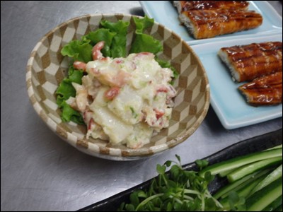 北寄貝のサラダも、用意しました。ちなみに、海老、鰻、北寄貝のサラダは、既製品です。