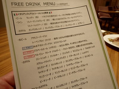 フリードリンクのメニューをもらい、