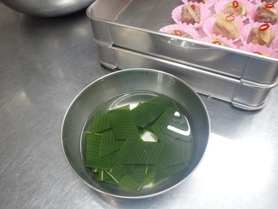 掻敷(かいしき)にする笹の葉を包丁し、明日の準備は終わりました。