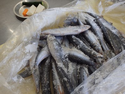 『鰯の丸煮』に仕込む真鰯(青森)を冷凍庫から出してから、