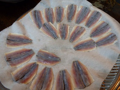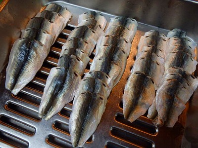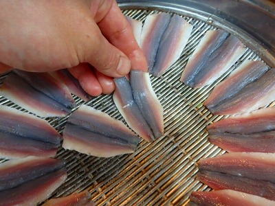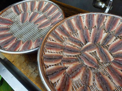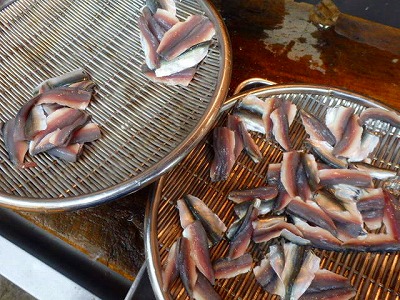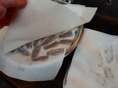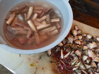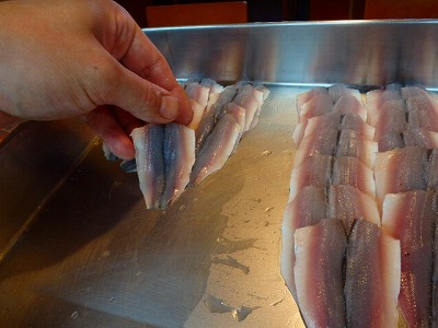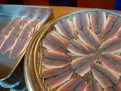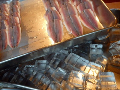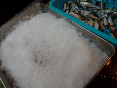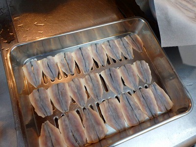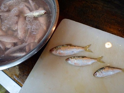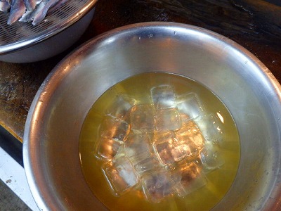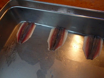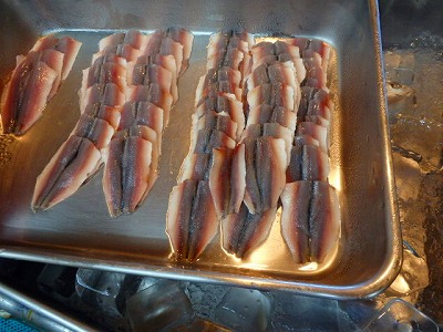 開きました。小さい魚ゆえ、鮮度が落ちやすいので、バットの下には、