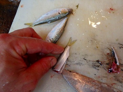 はらわたを抜き、卸した始めたものの、まな板には乗りきらないので、途中まで開いた時点で、