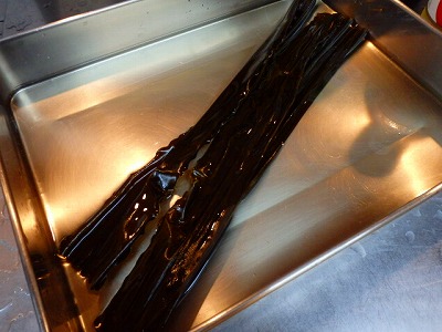 スチームコンベクションオーブンで、低温で、加熱しました。こうすることで、旨味が逃げないだけでなく、保存性も高まり、この調理法を、真空調理と呼んでいます。仕上がった下足は、