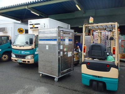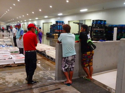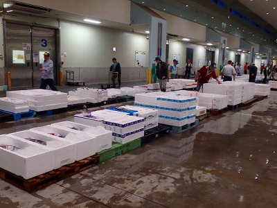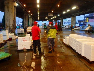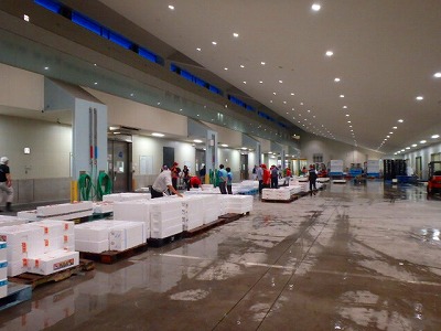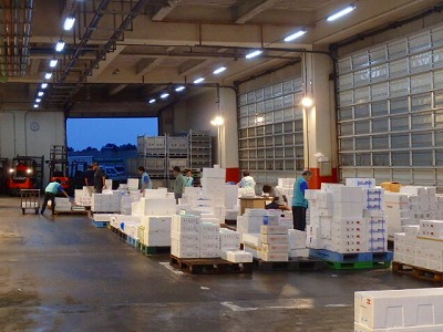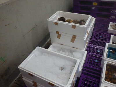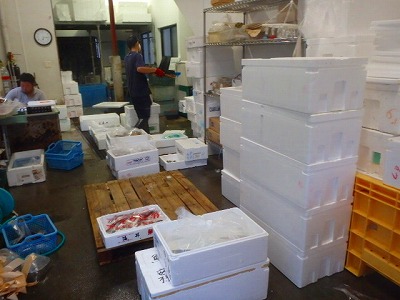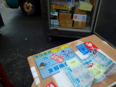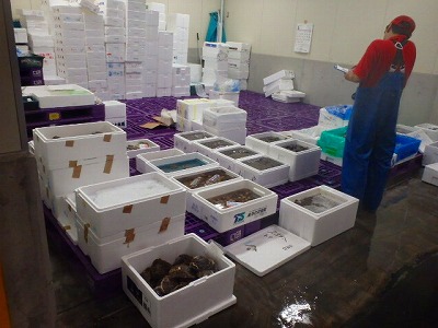 井戸端会議中でした。それでも、他所の漁港や市場から届く陸送便の荷物は、