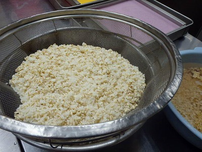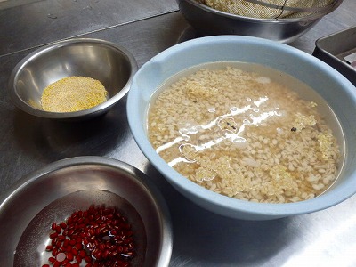 ひじき御飯に使う米(白米、押麦、もち米)を研いで、仕込みは終わりました。