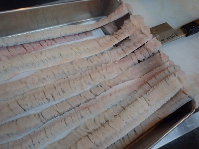 卸してから、骨切りをしました。この4つは、鱧料理の定番である“落とし”にするためのもので、