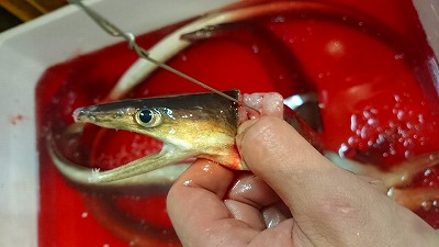 脊髄に、細い針金を入れて、神経を抜きました、こうするのは、脳からの伝達が遅れ、身の鮮度が保たれるからです。