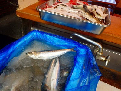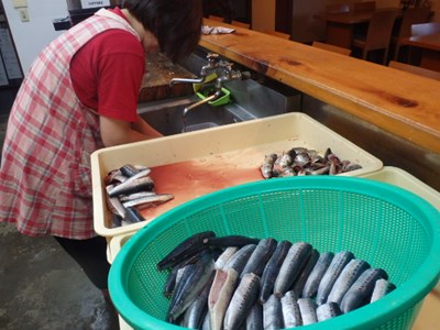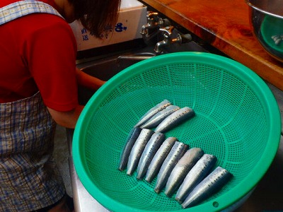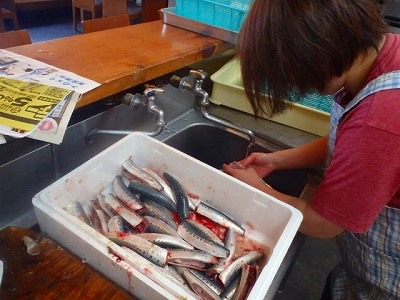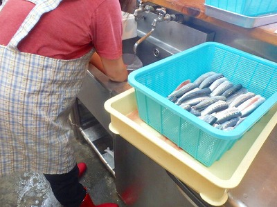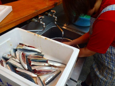 真鰯の頭とはらわたを取り除きましたが、それを、女将兼愛妻(!?)の真由美さんが、水洗いをしてくれました。