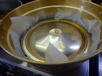 鍋に、切れ目を入れたクッキングシートを敷き、