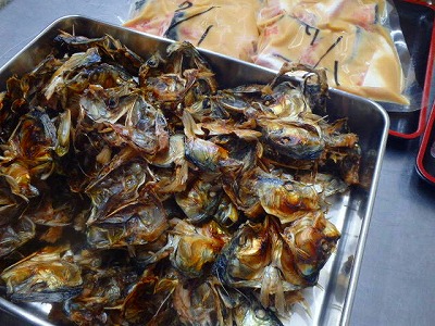 えらや血のついた部分を取り除いた真鰯の頭で、こんがり焼いてから、出汁を取ります。
