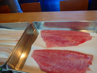 水洗いをし終えた金目鯛とサーモンを、