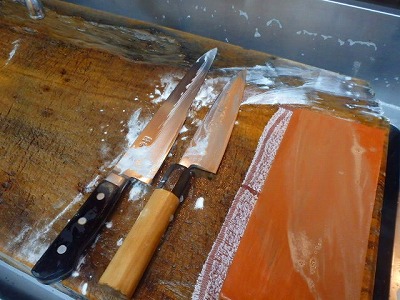 金目鯛の鱗を取ったのですが、サーモンは、鱗が細かいので、すき引きという方法で、包丁を使って、取り除きました。ちなみに、平目や鰤(ぶり)などの鱗を取る時にも、この方法で、鱗を取ります。