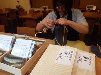 『鰯の丸煮』のご注文を、急遽頂き、女将兼愛妻(!?)の真由美さん達に、包装してもらいました。