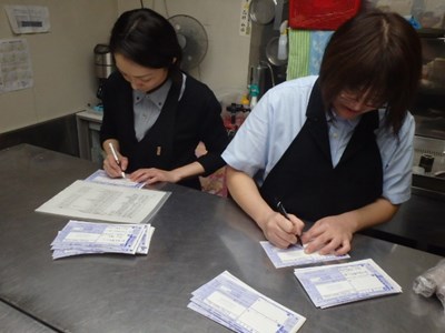 夜のお客様が見える前に、シール貼りをし、