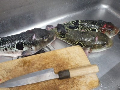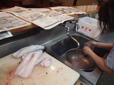 とらふぐを水洗いし終えたものの、