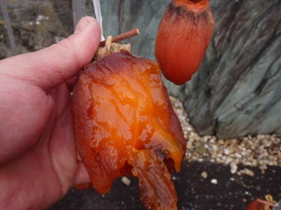 破れてしまい、中からでてきた果肉を味見したところ、程よく渋が抜けており、干し柿らしい感じでした。