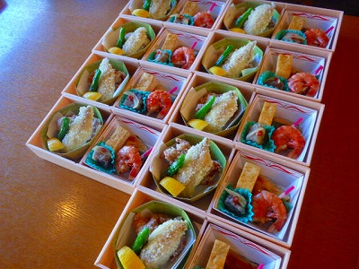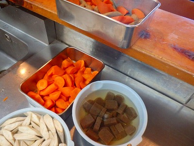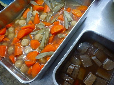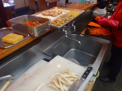 お弁当の仕上げから、一日が始まりました。数もそれほど多くなかったので、ひと通りの料理が出来上がったら、明日のお弁当用の煮物を仕込むため、盛り付けを始める前に、女将兼愛妻(!?)の真由美さんに、