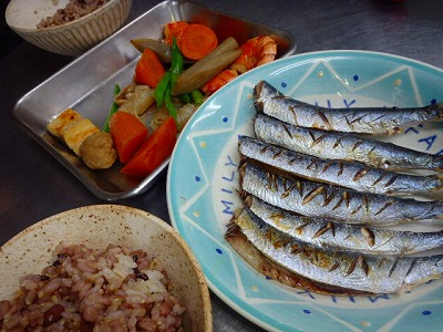 今朝のお弁当の余りものと、真鰯の塩焼をおかずにしました。小さいながらも、脂も程良く乗っているでかけでなく、身の質も良かったので、他の料理の仕上りも、期待出来そうです。