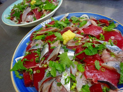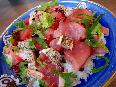 ここまでお話しした丼ものは、どれも一種類とか、せいぜい三種類の魚だけで作ったものですが、偶然が重なり、余りものが少しずつある時に、ごくまれに作った丼が、