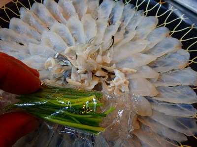 収録に持っていくふぐ刺を引きました。その後、前盛に使うふぐ葱をラップに包んだものを、