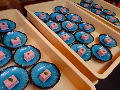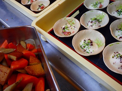 煮物が、煮上がり、先付の南京豆腐の盛り付けを終えると、