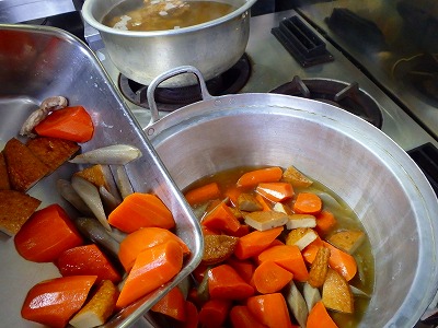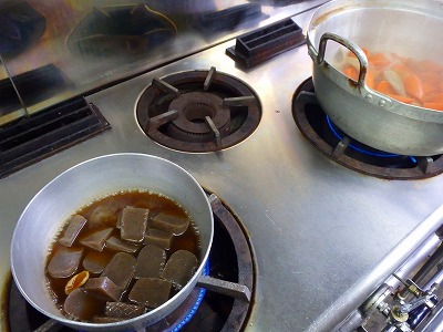 今度は、もう一つの煮物の蒟蒻を、火にかけました。山かけを盛り付け終わった頃に、