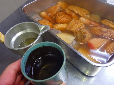お客様のお帰りを待ちながら、厨房で、夕べのおでんの残りと熱燗で、長い一日の疲れを癒したのでした。
