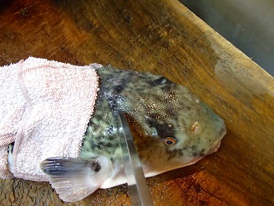 焼物の串を打ったりしました。その後、一昨日仕入れ、水槽に入れておいた長崎産のとらふぐ(天然)を、