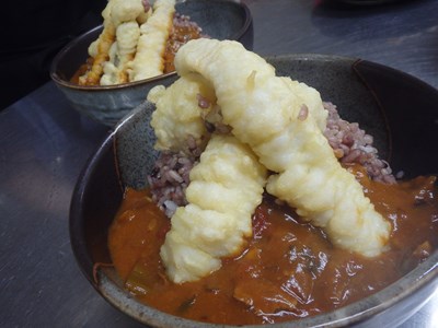 長いままの天ぷらを乗せて、カレー天丼にしたこともあります。