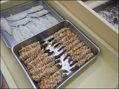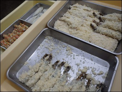 揚物の鯵や海老に衣をつけておきました。 また、お子様料理のご予約も頂いているので、海老などに、