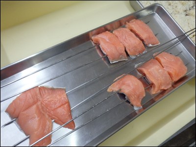 そのお弁当用の揚物にも、パン粉をつけておいただけでなく、焼物のサーモンの西京漬にも、