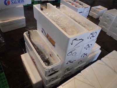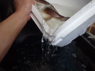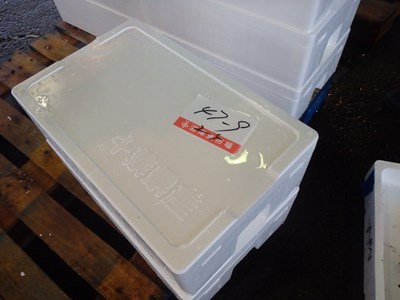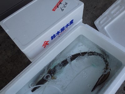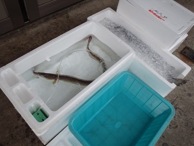 大きな発泡スチロールが、3つ並べられており、活ハモと書かれていました。