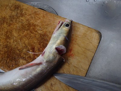 “落ち鱧”と呼ばれている、輸送中や生簀の中で死んでしまった鱧を、5本仕入れ、ご覧のように、大分産のものが、4本(2,2キロ)で、和歌山産のものが、1本(0,8キロ)でした。