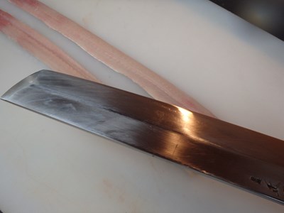 鱧の下拵えで欠かすことの出来ない骨切りをするため、専用の骨切り包丁の出番となりました。