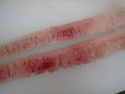 一日とは言え、水槽に入れていると、その時の鱧の状態にもよりますが、尾に近い部分は、