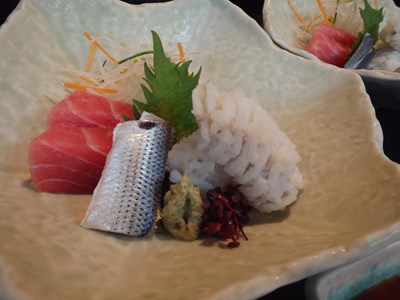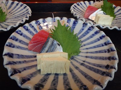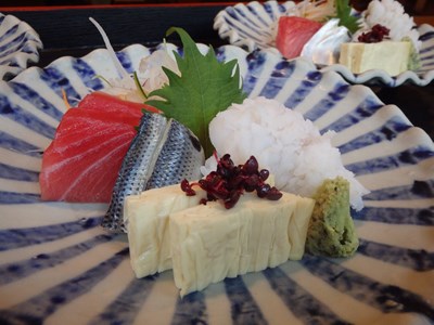 鱧以外の刺身を盛り付け、冷蔵庫にしまい、お客様がご来店するのを、末ばかりとなりましたが、盛り付けてあるのは、生の本鮪(那智勝浦)、小肌(佐賀)、湯葉です。