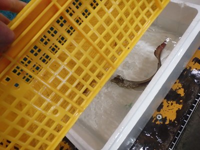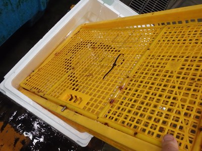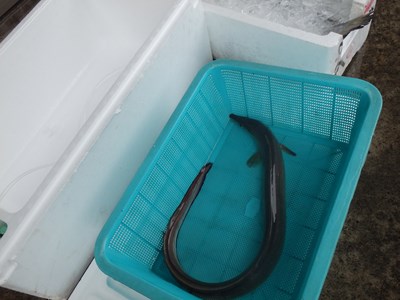 昨日、売場の担当者から聞いていたように、徳島県産の鱧が入荷しており、この2つの籠の下には、鱧が入っていました。