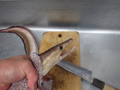 骨切りし終えた鱧の身の尾に近い部分の皮を、