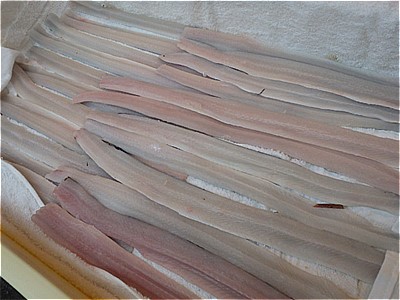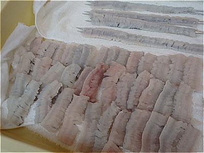 このようにしてもらってあるのは、内臓にえさが残ったまま、死んでしまうと、その臭いが身に回ってしまい、使い物にならないからです。