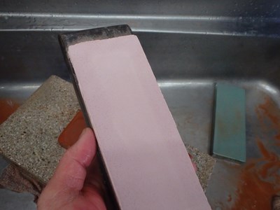 そして、左側の薄いピンク色のものが、仕上げと呼ばれる砥石で、より鋭い切れ味を求めたい時に使い、研いだ面も、鏡のようになります。