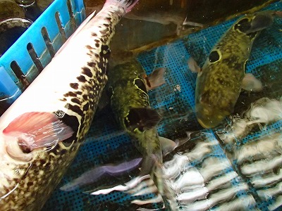 三重県産のとらふぐで、全部で8本です。長旅の疲れはなかったものの、窮屈な発泡スチロールに入れておくわけにもいかないので、とりあえず、全て水槽へ。