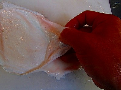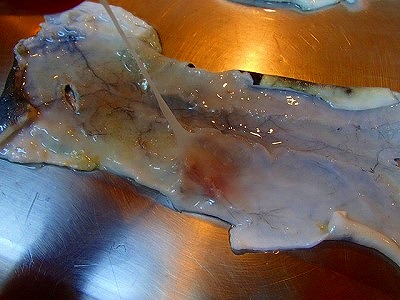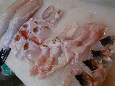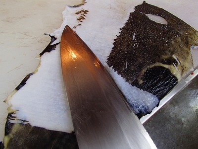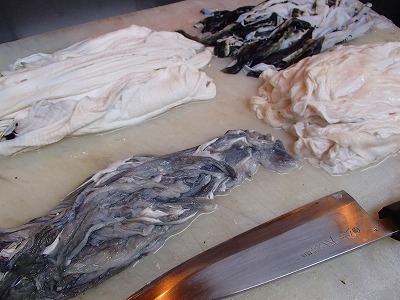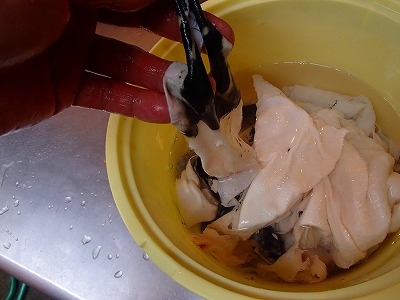 お腹の側の部分の粘膜を取り除き、棘のある部分とその内側の皮の部分に分けておいたので、
