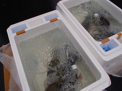 三重県から、5本の天然のとらふぐ入荷することが分かっていたからです。ちなみに、この写真は、出荷直前のものですので、海水も透明ですし、ご覧のように、“ブクブク”を二つセットしてあるのは、一つダメになった時に備えてのことです。