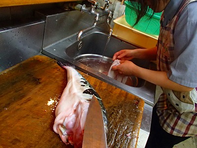 先程お話ししたように、今日は3本仕入れ、そのうちの2本卸し、水槽には、もう1本いて、明日卸す予定ですので、まな板回りを養生してから、今日の仕事は、終わりました。