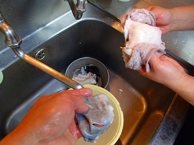 ふぐを卸しているそばから、ふぐの仕込みの中でも、手間がかかるものの一つでもある“水洗い”を、手伝ってくれました。天然のとらふぐと女将兼愛妻(!?)、まさに両手に花とは、このことですし、否が応でも、仕事がはかどります。