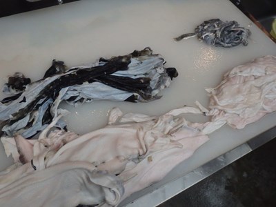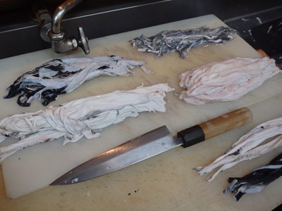 ふぐ皮の掃除は、粘膜を取ることで、かなり手間がかかる仕込みで、このような感じです。
