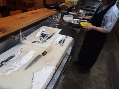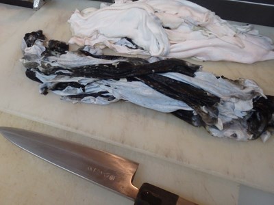 女将兼愛妻(!?)の真由美さんに手伝ってもらいながら、ふぐ皮の掃除をし始めました。