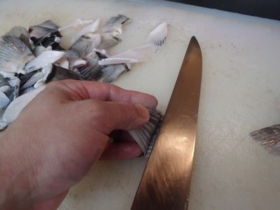 ひれ酒にするため、ふぐのひれを半分に包丁し、