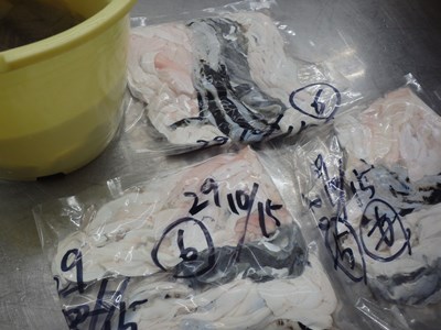 日付と入数を書き、真空パックして冷凍庫へしまい、ふぐの仕込みが、全て終わりました。
