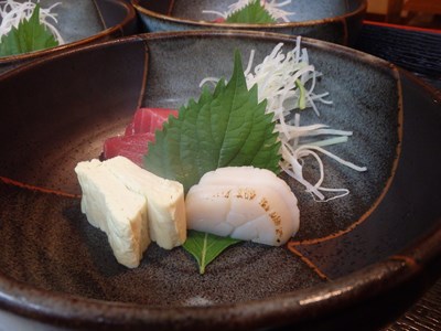 先付の次が、刺身で、生の本鮪(大間)、帆立(北海道)、湯葉の三種盛りで、山葵、紅蓼が無いのは、お子様にお出ししたものだからです。